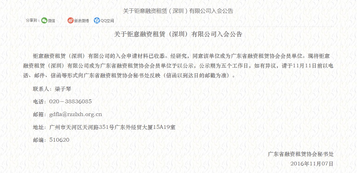 为了提高我司于行业知名度及诚信体系建设,增加与业界的交流合作、信息收集,我司正式加入广东省融资租赁协会成为会员单位。 广东省融资租赁协会于2015年9月25日在广州正式成立,由广东省内各类融资租赁机构(企业)自愿组建、社会相关经济组织的全省性、联合性、专业性、非营利性的社会团体。为的是规范和促进我省融资租赁行业的发展,提高行业管理水平和服务水准;于我国相关政府部门、商会、协会和企业建立良好的沟通渠道,努力实现我省融资租赁行业的健康可持续发展。 关于钜意融资租赁(深圳)有限公司入会公告