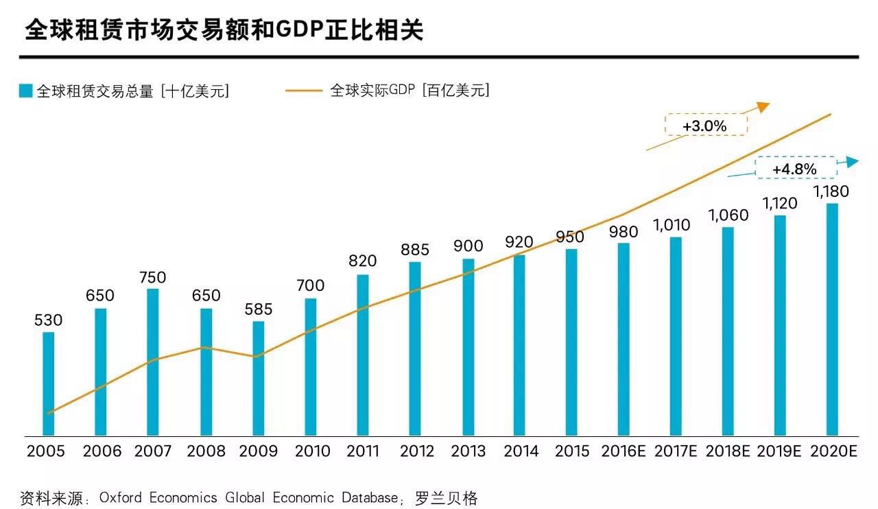 报告认为,融资租赁的本源是基于产业设备的融资,GDP增长与行业发展存在直接的正比关系,根据2016-2020年全球经济3%的稳健增长预测,预计全球租赁市场仍将保持4.8%的中高速增长。