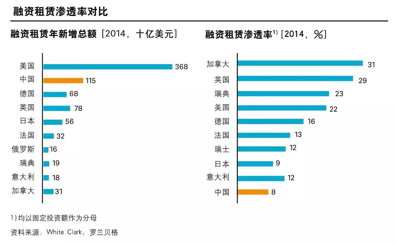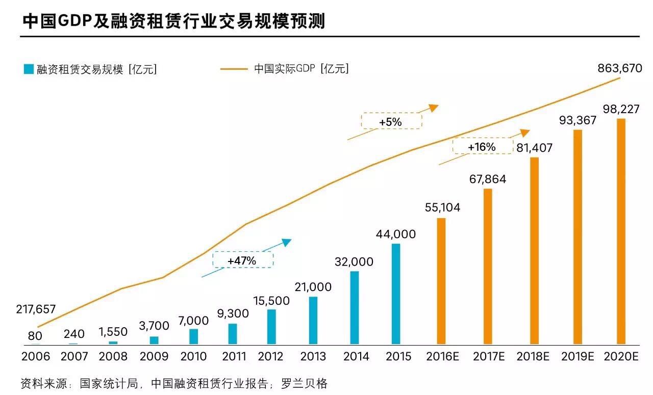 基于经济增长“新常态”下5%的GDP增速假设,中国融资租赁行业未来五年的复合增速预计将降至16%,交易规模至2020年约达9.8万亿元。对比成熟市场,虽然中国租赁市场增长显著,新增余额也位居全球市场前列,但融资租赁渗透率偏低,潜力依然很大。