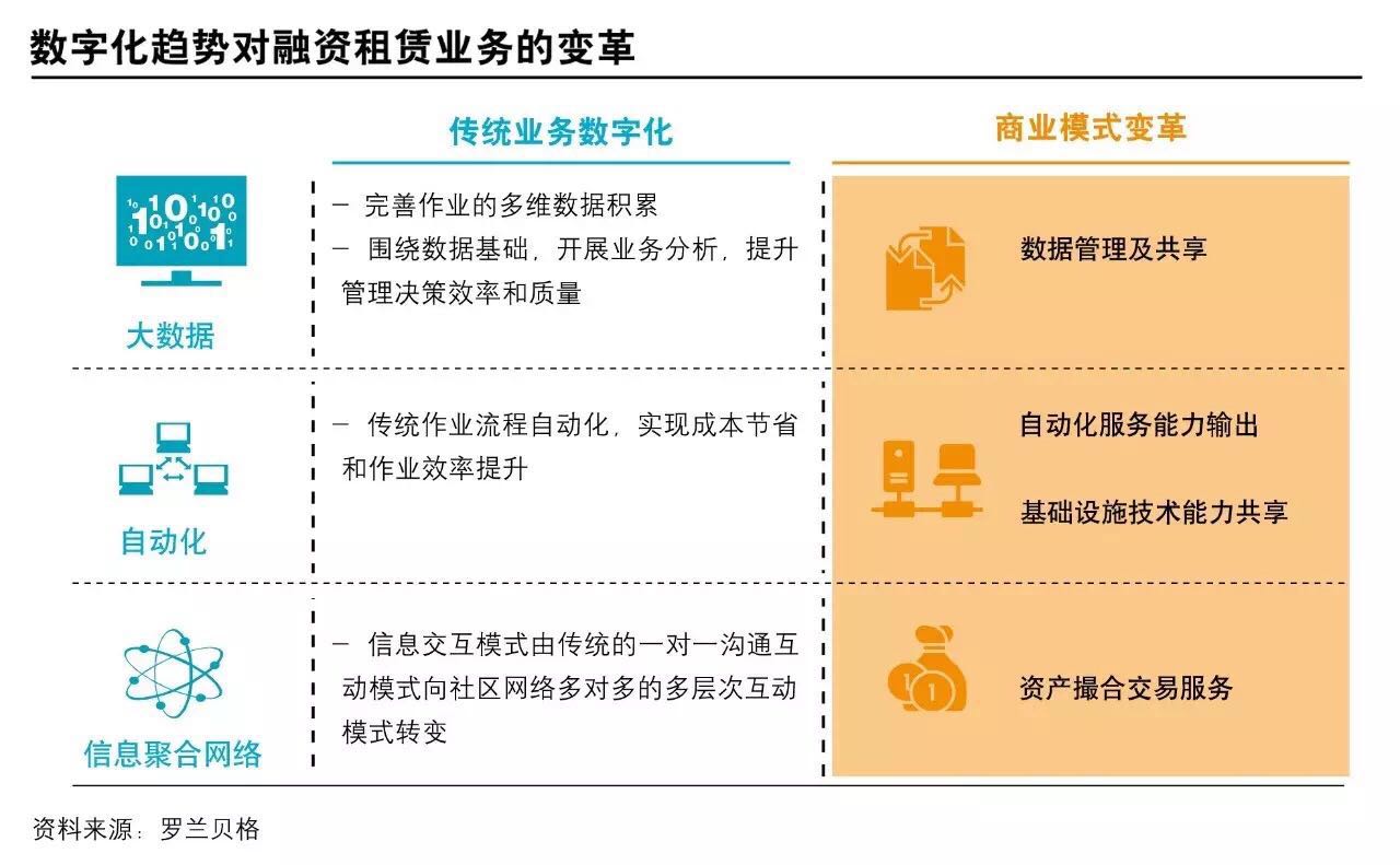 2016年以来,金融科技成为市场主流话题,数字化趋势的三个重要方面——大数据、自动化与信息聚合网络——将会为融资租赁业发展带来深远影响,行业有机会出现颠覆者。