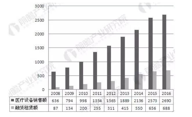 2016年中国医疗器械行业共实现销售收入2690亿元,融资租赁额约为688亿元。从近年来医疗器械和医药工业总产值增速来看,医疗器械的发展速度总体上快于医药工业。未来随着融资租赁业务的优势,医疗设备行业融资租赁的渗透率将进一步提高。